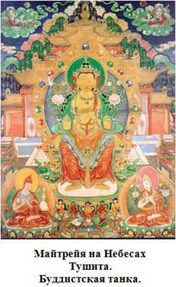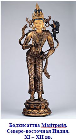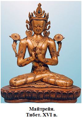 Майтрейя – грядущий Будда, преемник Будды Шакьямуни (Гаутамы Будды). Об этом повествуется в «Дигха-Никайе» – одном из старинных текстов «Типитаки» («Корзины наставлений»), содержащей свыше 17 тысяч сутр, приписываемых Будде или его ближайшим сподвижникам. В пятой главе «Лалита-Вистары», одной из наиболее популярных в буддийской литературе биографий Будды, написанной в III-IV вв., сказано, что Совершенный, перед тем как сойти на землю с небес Тушита, для того чтобы стать Буддой, указал на Бодхисаттву Майтрейю как на своего преемника и возложил ему на голову свой собственный венец Бодхисаттвы.