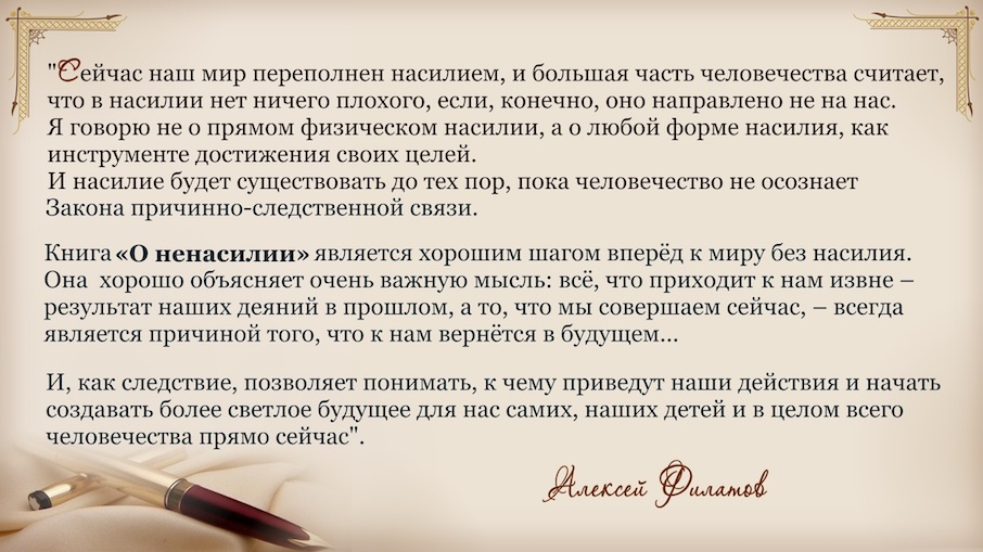 Автор отмечает, что уровень агрессии и насилия в мире постоянно растёт, и корень зла заключается в уровне сознания большинства человечества. Только совершенствуя своё сознание, мы сможем получить более справедливое устройство общества и всей жизни. Убирая из своего сознания агрессию, ненависть, неприязнь и заменяя эти несовершенные состояния божественными проявлениями Любви, Сострадания и Милосердия, мы влияем на всё, что нас окружает в нашем мире, и совершенствуем его.